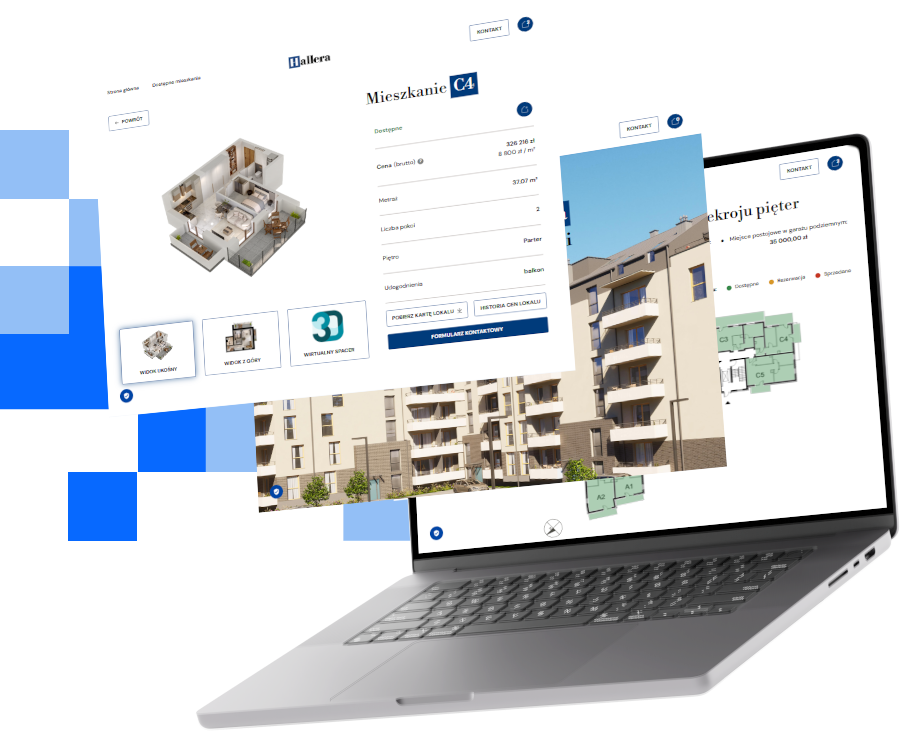 Posiadamy wewnętrzne narzędzia m.in. do prezentacji oferty mieszkaniowej na stronie. Są to np. tradycyjne wyszukiwarki mieszkań, makiety 3D z wyborem mieszkań, wybór mieszkań z rzutu pięter.