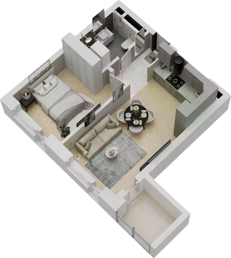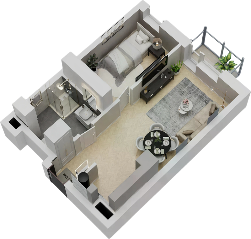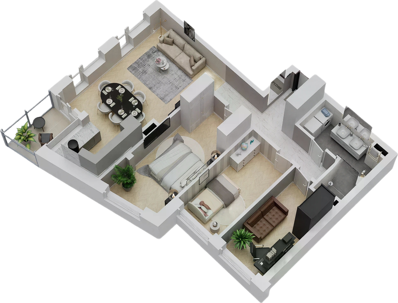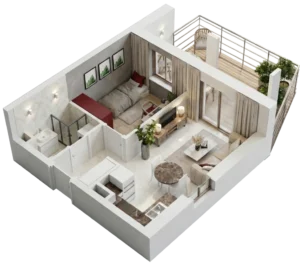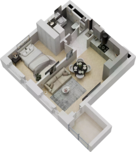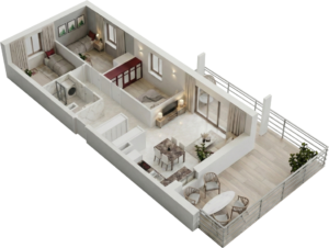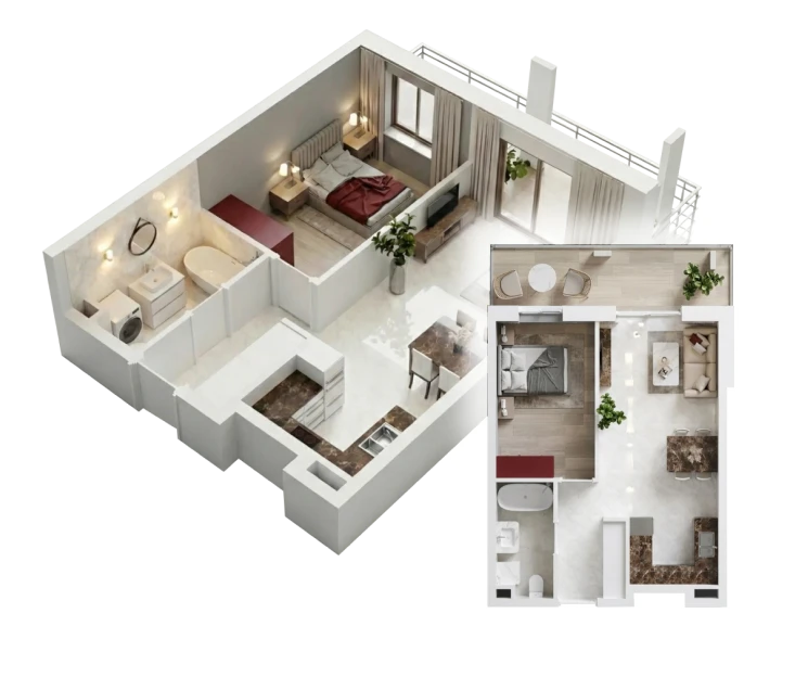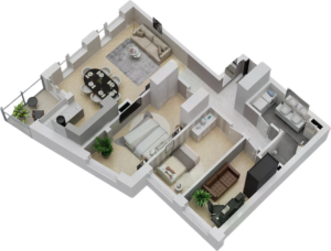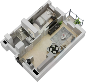 Rzuty 3D lokali mieszkalnych oraz usługowych wykonujemy w dwóch wariantach: widok z góry i widok ukośny (aksonometryczny). Ich znaczenie w prezentacji oferty jest nieocenione – pozwalają zobaczyć klientowi realne mieszkanie, a nie jedynie dane techniczne i plany architektoniczne.