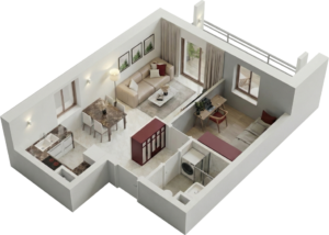 Rzuty 3D mieszkań i domów wykonujemy w dwóch wariantach – rzut z góry i rzut ukośny (aksonometryczny)
